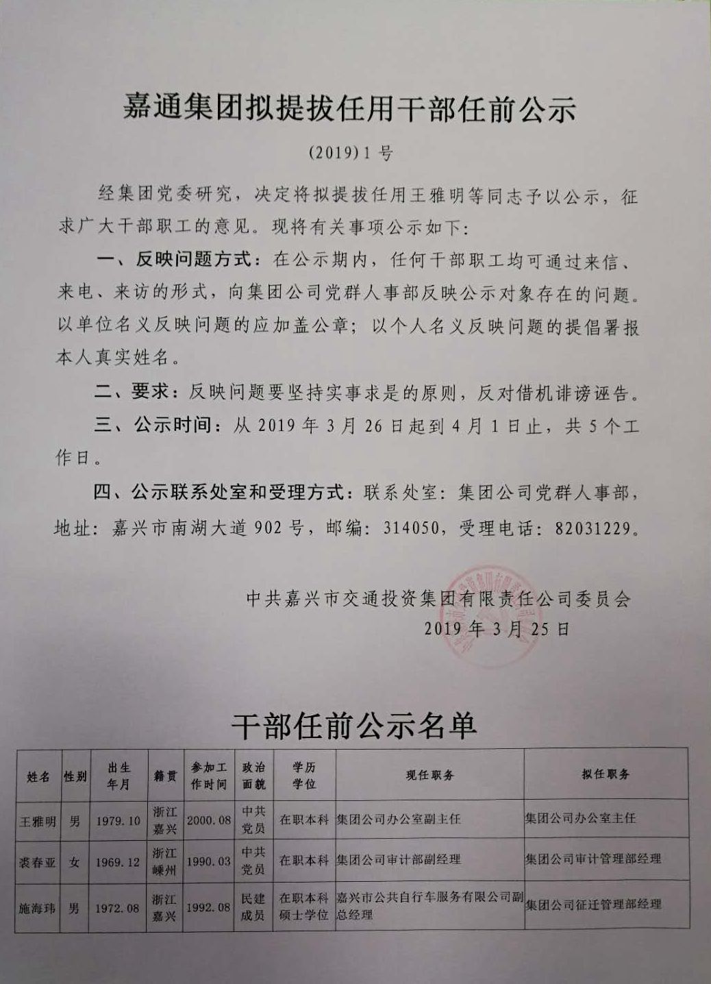 2019年1號嘉通集團擬提拔任用干部任前公示