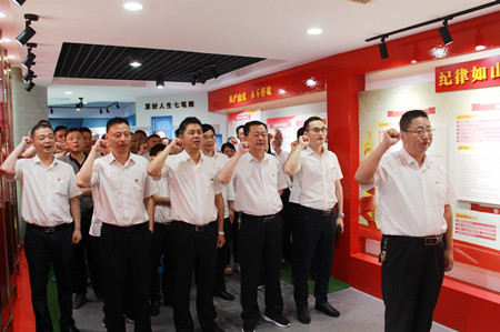 大家首先觀看了《鐵窗相伴的日子》《最后的迷失》兩部法制警示紀(jì)錄片。隨后,大家跟著講解員進(jìn)入法紀(jì)教育展廳,參觀了“一著不慎 滿盤皆輸”“紀(jì)律如山 規(guī)行矩步”“從嚴(yán)治黨 永不停歇”三個(gè)主題展區(qū),并仔細(xì)閱讀了“信念動(dòng)搖入岐途”“貪欲膨脹成碩鼠”“交友不慎釀苦果”“道德滑坡墜深淵”四個(gè)方面的反腐案例。最后,全體黨員一起重溫入黨宣誓。