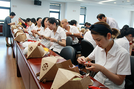 現(xiàn)場(chǎng)除了本就心靈手巧的女同胞外,還不乏許多看似“笨拙”的男同胞。然而,當(dāng)他們放下平時(shí)握慣的方向盤(pán),拿起繡花針做起針線活時(shí),卻也絲毫不馬虎,穿針引線、縫合香包,架勢(shì)和手藝一點(diǎn)也不遜色。但兩個(gè)多小時(shí)做下來(lái),他們也不禁感慨:“做香囊可比開(kāi)汽車(chē)難多了,細(xì)心、耐心、恒心一樣都不能少,但能學(xué)到一門(mén)傳統(tǒng)手工藝術(shù),確實(shí)是一件很開(kāi)心的事情!”雖然很多員工都是第一次自己動(dòng)手制作香囊,但大家都很認(rèn)真,仔細(xì)聆聽(tīng),主動(dòng)請(qǐng)教,當(dāng)看到自己辛辛苦苦的勞動(dòng)成果后,都紛紛拿出手機(jī)拍照,并發(fā)在微信朋友圈與朋友們分享。