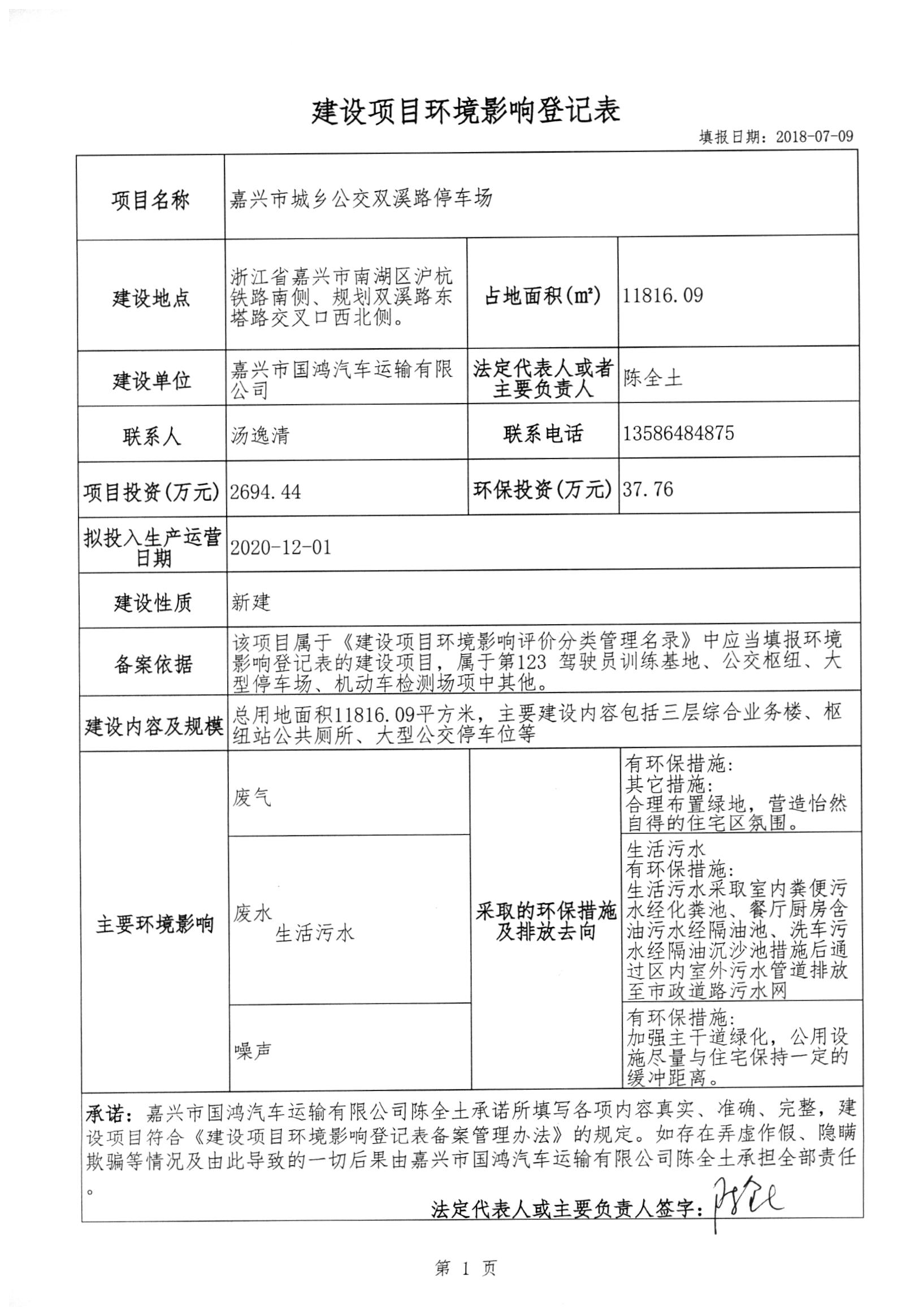 嘉興市城鄉(xiāng)公交雙溪路停車(chē)場(chǎng)建設(shè)項(xiàng)目環(huán)境影響登記表